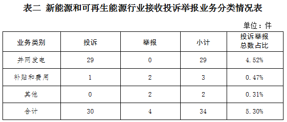 新能源和可再生能源行業(yè)排在第二位,數(shù)量為34件、占投訴舉報(bào)總數(shù)的5.30%,主要集中在并網(wǎng)發(fā)電、補(bǔ)貼和費(fèi)用等方面。