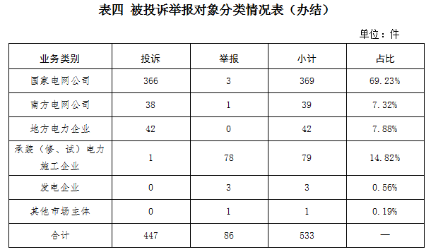 從被投訴舉報(bào)對(duì)象看,供電企業(yè)450件、占投訴舉報(bào)總數(shù)的84.43%,其中國家電網(wǎng)公司369件、占投訴舉報(bào)總數(shù)的69.23%,南方電網(wǎng)公司39件、占投訴舉報(bào)總數(shù)的7.32%,地方電力企業(yè)42件、占投訴舉報(bào)總數(shù)的7.88%;承裝(修、試)電力施工企業(yè)79件、占投訴舉報(bào)總數(shù)的14.82%;發(fā)電企業(yè)3件、占投訴舉報(bào)總數(shù)的0.56%;其他市場(chǎng)主體1件、占投訴舉報(bào)總數(shù)的0.19%。