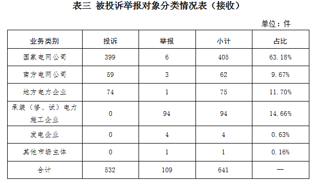 供電企業(yè)542件、占投訴舉報(bào)總數(shù)的84.55%,其中國家電網(wǎng)公司405件、占投訴舉報(bào)總數(shù)的63.18%,南方電網(wǎng)公司62件、占投訴舉報(bào)總數(shù)的9.67%,地方電力企業(yè)75件、占投訴舉報(bào)總數(shù)的11.70%;承裝(修、試)電力施工企業(yè)94件、占投訴舉報(bào)總數(shù)的14.66%;發(fā)電企業(yè)4件、占投訴舉報(bào)總數(shù)的0.63%;其他市場(chǎng)主體1件、占投訴舉報(bào)總數(shù)的0.16%。
