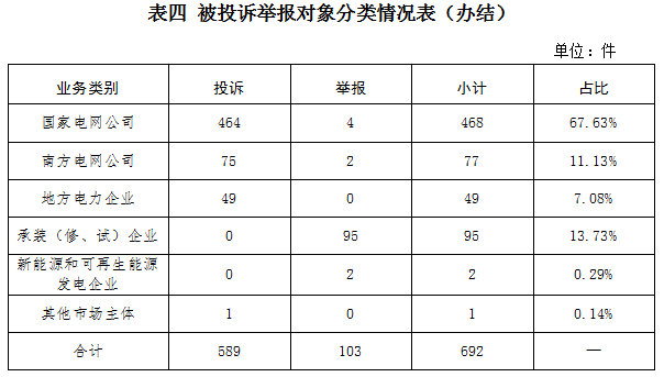 從被投訴舉報對象看,供電企業(yè)594件、占投訴舉報總數(shù)的85.84%,其中國家電網(wǎng)公司468件、占比67.63%,南方電網(wǎng)公司77件、占比11.13%,地方電力企業(yè)49件、占比7.08%;承裝(修、試)電力設施施工企業(yè)95件、占比13.73%;新能源和可再生能源發(fā)電企業(yè)2件、占比0.29%;其他市場主體1件、占比0.14%。