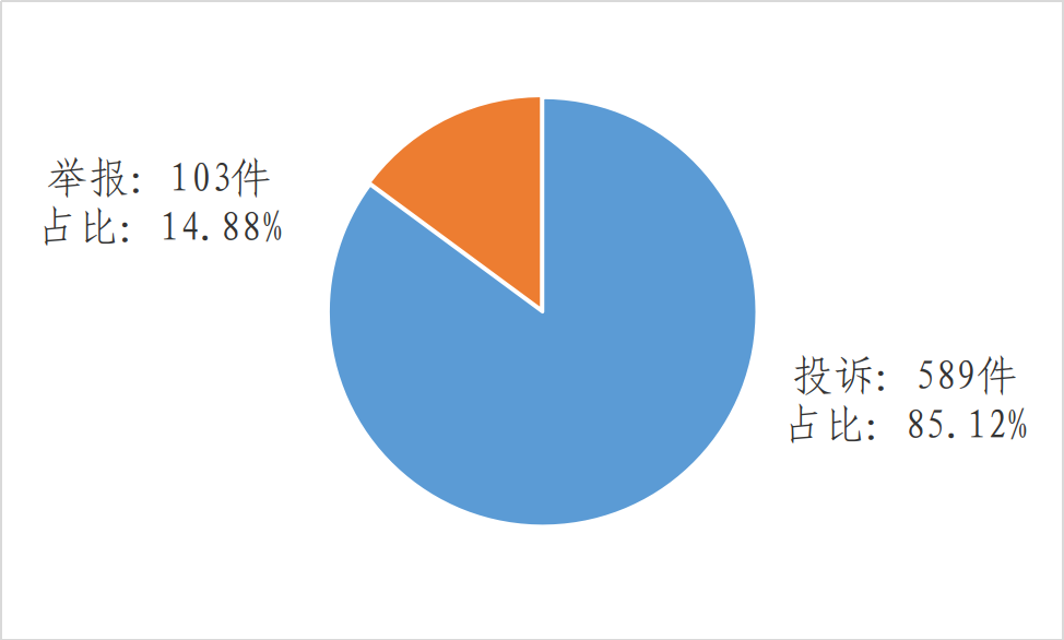 2023年6月,12398熱線共接收投訴舉報942件,環(huán)比增長19.85%、同比下降34.76%。其中:投訴810件,環(huán)比增長17.39%、同比下降41.39%;舉報132件,環(huán)比增長37.50%、同比增長112.90%。