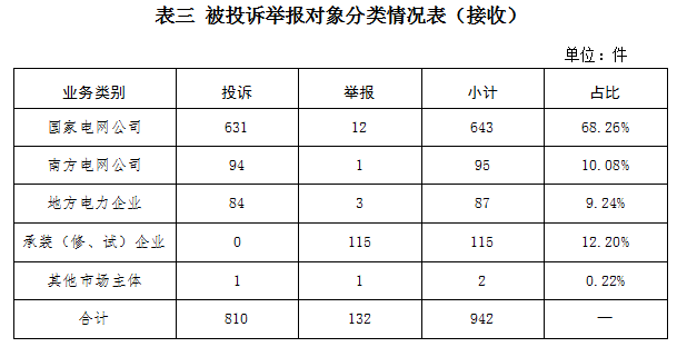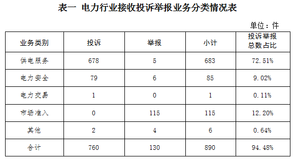 電力行業(yè)排在首位,數(shù)量為890件、占投訴舉報總數(shù)的94.48%,主要集中在供電服務、市場準入、電力安全等方面。