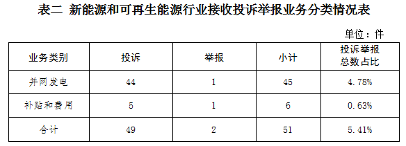 新能源和可再生能源行業(yè)排在第二位,數(shù)量為51件、占投訴舉報總數(shù)的5.41%,主要集中在并網(wǎng)發(fā)電、補貼和費用等方面。