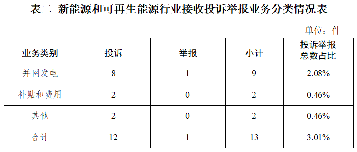 新能源和可再生能源行業(yè)排在第二位,數(shù)量為13件、占投訴舉報總數(shù)的3.01%,主要集中在并網(wǎng)發(fā)電、補貼和費用等方面。