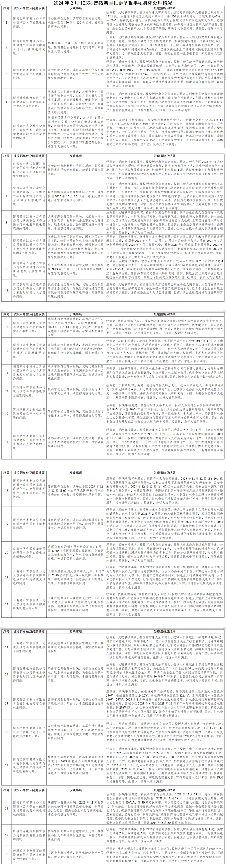 針對群眾反映的投訴舉報,國家能源局派出機構嚴格根據(jù)國家有關法規(guī)政策進行處理。一是督促供電企業(yè)加大電力設施建設、維護等資源投入,縮短供電半徑,提高電網(wǎng)轉(zhuǎn)供、互供能力,有效解決故障停電、低電壓等電能質(zhì)量問題,進一步提升供電可靠性;二是要求供電企業(yè)加強設備隱患排查整治和停電搶修管理,加強線路巡視頻次,及時消除隱患缺陷,增加搶修資源投入,提升設備管控和停電搶修能力,切實提高供電質(zhì)量;三是通過行政處罰、監(jiān)管約談、責令整改等方式,糾正有關企業(yè)違法違規(guī)行為,維護公平公正的市場秩序和群眾合法權益;四是通過解釋說明、澄清事實,使群眾消除誤解。(2024年2月12398熱線典型投訴舉報事項具體處理情況,見附件2)