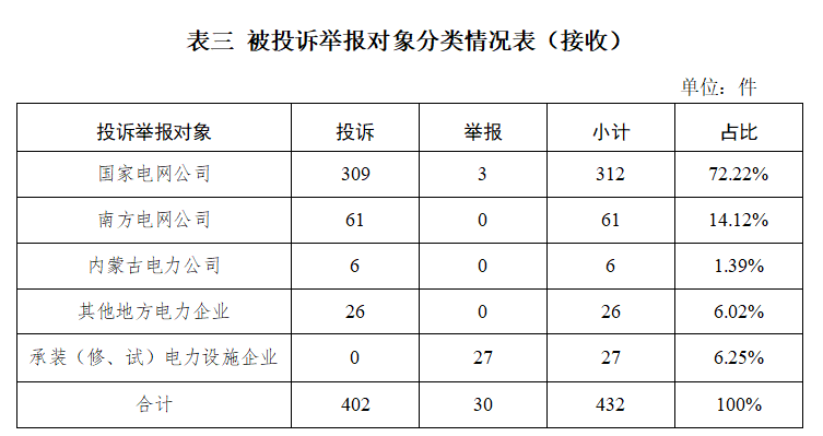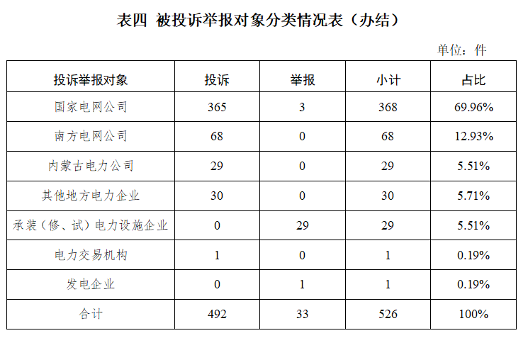 從被投訴舉報對象看,供電企業(yè)495件、占投訴舉報總數(shù)的94.10%,其中國家電網(wǎng)公司368件,占比69.96%;南方電網(wǎng)公司68件,占比12.93%;內(nèi)蒙古電力公司29件,占比5.51%;其他地方電力企業(yè)30件,占比5.71%;承裝(修、試)電力設施企業(yè)29件,占比5.51%;發(fā)電企業(yè)1件,占比0.19%;電力交易機構1件,占比0.19%。