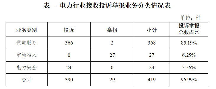 電力行業(yè)排在首位,數(shù)量為419件、占投訴舉報總數(shù)的96.99%,主要集中在供電服務、市場準入、電力安全等方面。