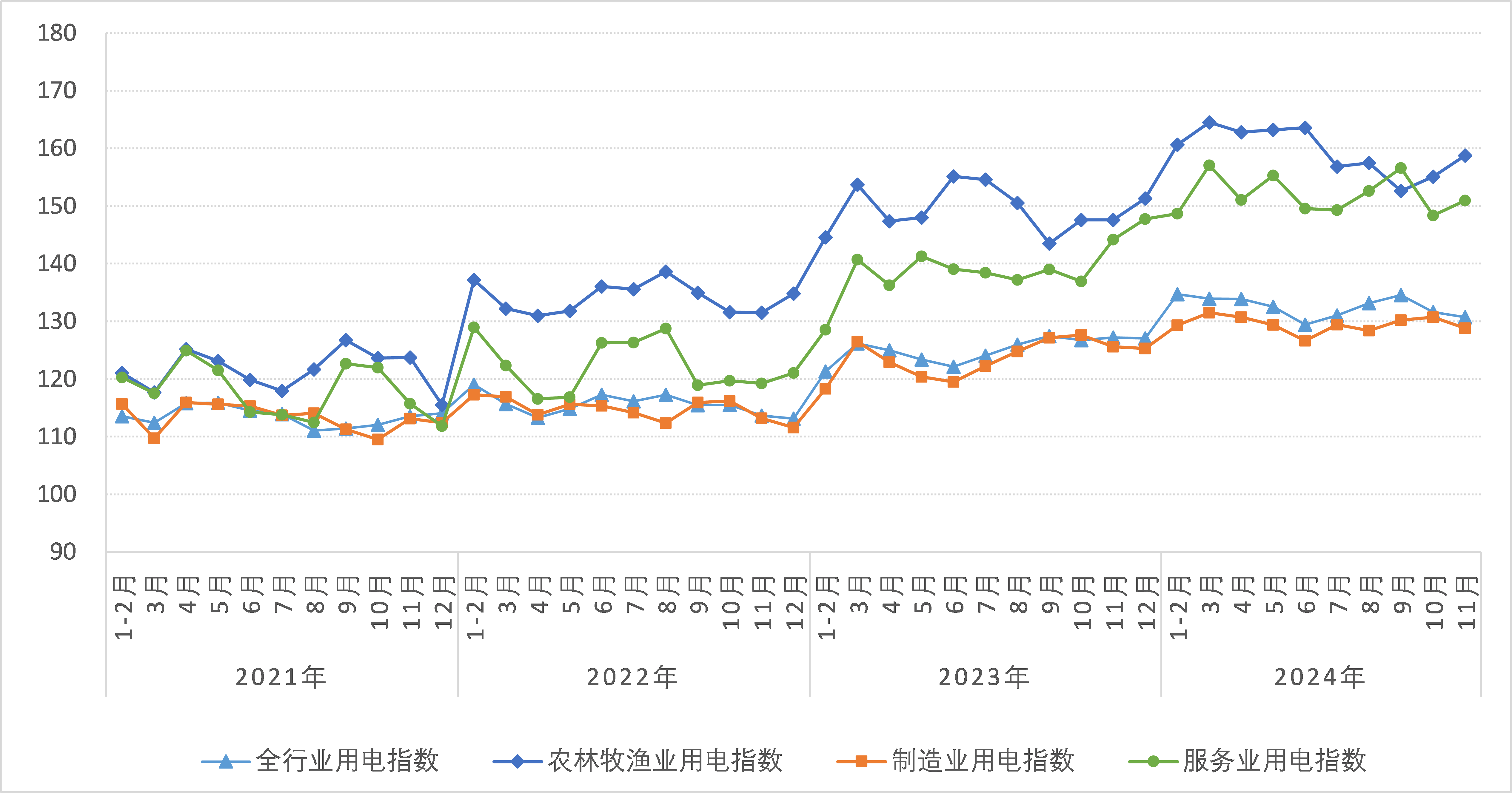 2024年11月,全行業(yè)用電指數(shù)為130.7,全行業(yè)用電量比2020年基期增長了30.7%,年均增長6.9%,同比增長2.8%。