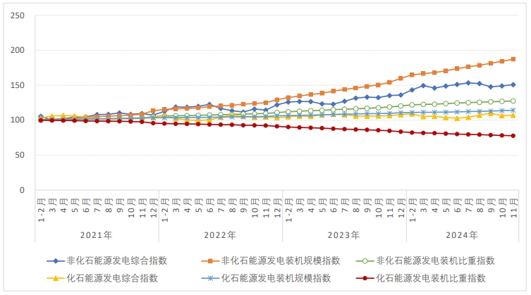 11月,非化石能源發(fā)電裝機(jī)規(guī)模指數(shù)為187.4,“十四五”以來(lái)非化石能源發(fā)電裝機(jī)規(guī)模累計(jì)增長(zhǎng)了87.4%,同比增長(zhǎng)21.6%。非化石能源發(fā)電裝機(jī)比重指數(shù)為127.5,“十四五”以來(lái)非化石能源發(fā)電裝機(jī)比重累計(jì)提升了27.5%(比重從2020年底的44.8%提高至2024年11月底的57.1%)。