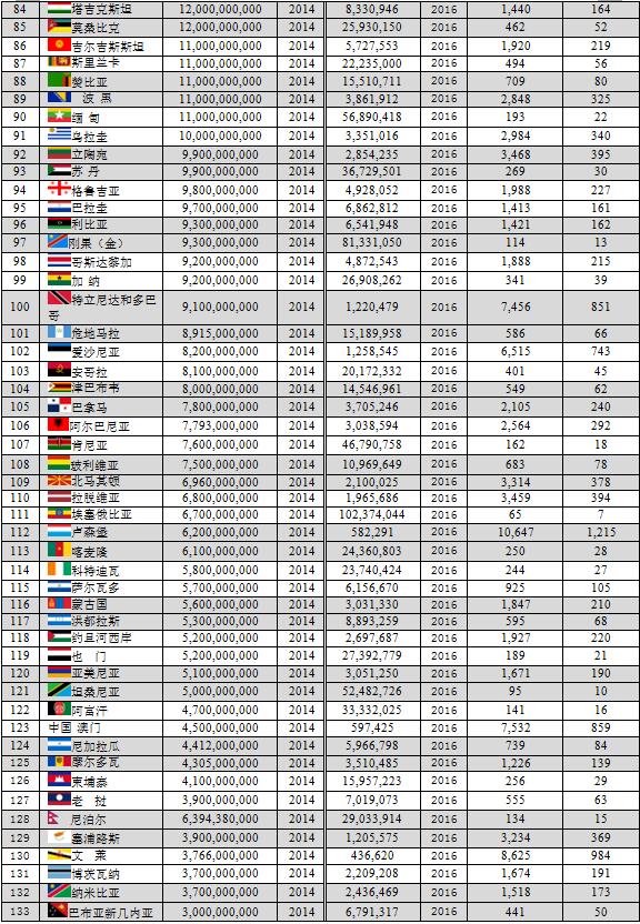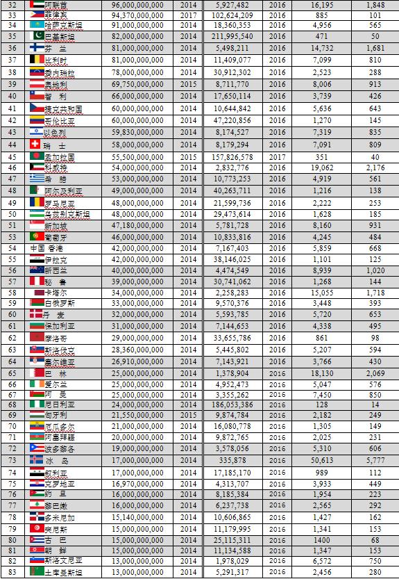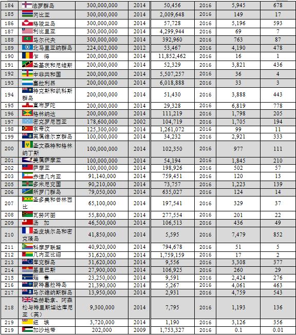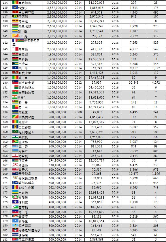 本文數(shù)據(jù)主要由美國中央情報局(CIA)統(tǒng)計,但個別國家如中國、印度尼西亞、阿聯(lián)酋、菲律賓、尼泊爾、北馬里亞納群島等由該國的統(tǒng)計機構(gòu)統(tǒng)計。
