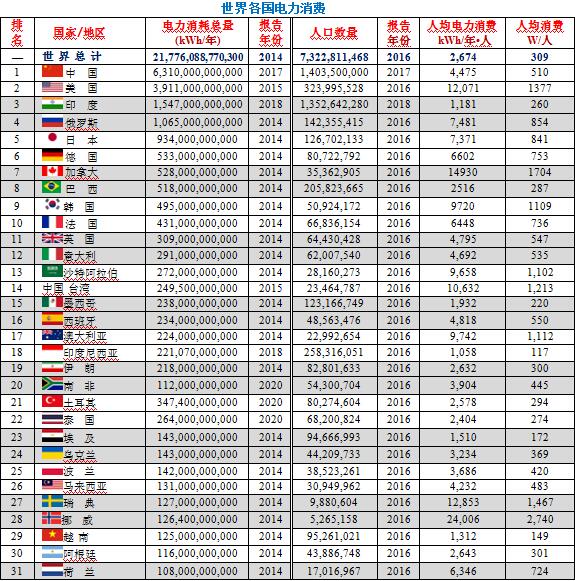 任何能源都可以發(fā)電,但是要進入電力市場必須價格能夠使用戶接受,電力消費數(shù)據(jù)也就是進入電力市場的數(shù)據(jù)。顯然世界各國電力消費的數(shù)據(jù)難以收集,所以數(shù)據(jù)滯后乃屬正常。本文“2020年:世界各國電力消費”是指在2020年收集到的數(shù)據(jù)并標明統(tǒng)計機構(gòu)名稱和年份,換句話說,目前是最新的了。