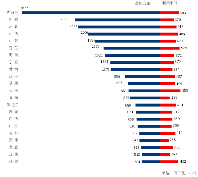 圖3 1-2月份風(fēng)電裝機(jī)較多省份風(fēng)電裝機(jī)容量和設(shè)備利用小時(shí)