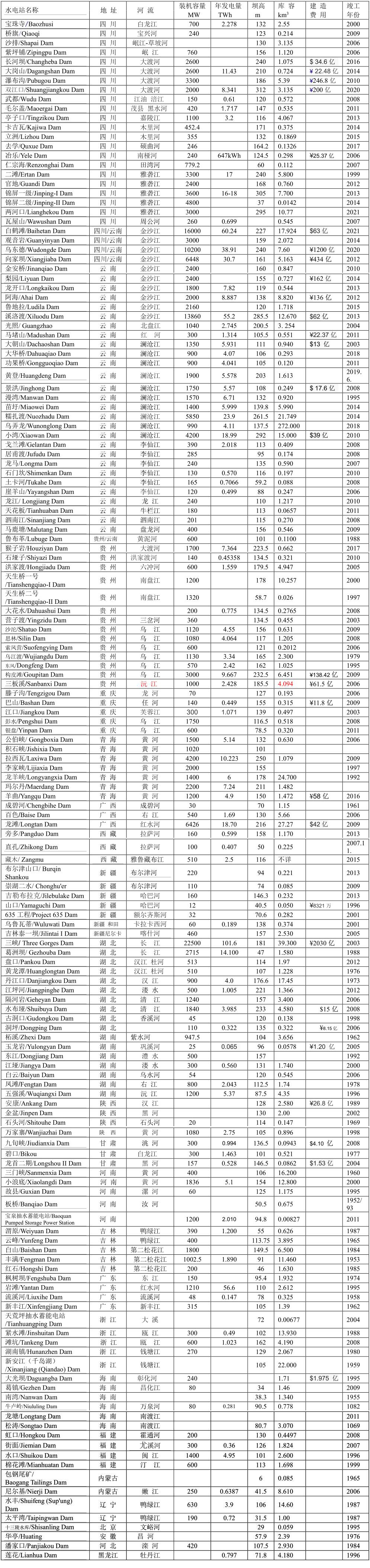 以下是中國(guó)正在運(yùn)營(yíng)和在建的水壩和水庫(kù)的部分清單。由于國(guó)內(nèi)外的電力單位表述單位不一樣,本文的單位換算如下: