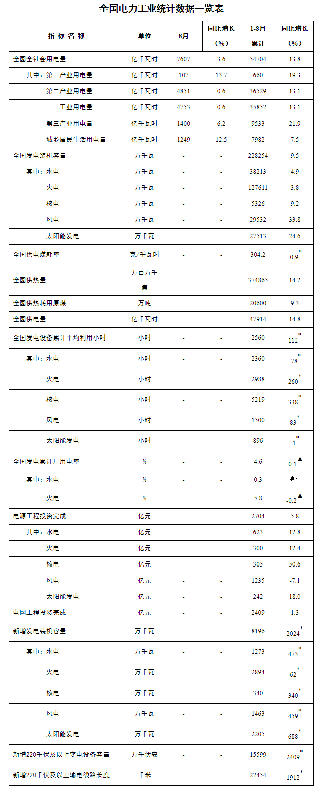 注:1.全社會(huì)用電量為全口徑數(shù)據(jù),全國供電量為調(diào)度口徑數(shù)據(jù)。2.“同比增長”列中,標(biāo)*的指標(biāo)為絕對量;標(biāo)▲的指標(biāo)為百分點(diǎn)。