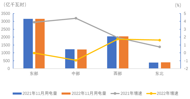 11月份,東、中、西部和東北地區(qū)全社會(huì)用電量增速分別為-0.02%、-0.9%、1.8%和1.6%。