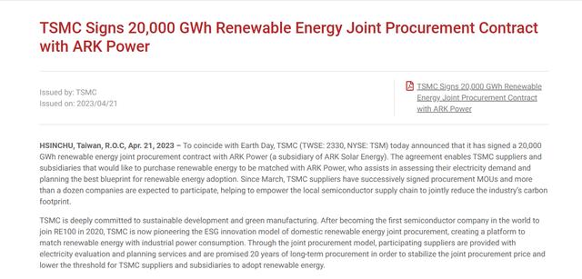 IT之家從臺積電官網獲悉,臺積電繼 2020 年后成為全球第一家加入全球再生能源倡議組織(RE100)的半導體企業(yè),首創(chuàng)再生能源聯(lián)合采購的 ESG 創(chuàng)新模式。