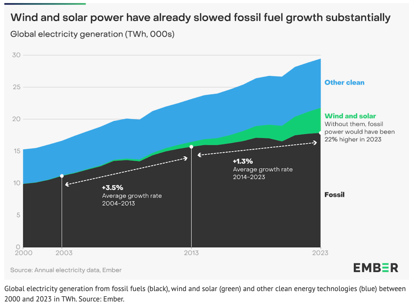 在全球范圍內(nèi),風(fēng)能和太陽(yáng)能現(xiàn)在的增長(zhǎng)速度已經(jīng)足以超過(guò)不斷增長(zhǎng)的電力需求,這意味著從2024年起,全球化石燃料發(fā)電量和排放量將達(dá)到峰值。因此,化石燃料發(fā)電量下降的新時(shí)代即將到來(lái)。2023年可再生能源滿足了創(chuàng)紀(jì)錄的30%的全球電力需求,如果不是這一年水力發(fā)電的創(chuàng)紀(jì)錄下降,2023年排放量可能已經(jīng)達(dá)到峰值。風(fēng)能和太陽(yáng)能的崛起阻礙了化石燃料發(fā)電的增長(zhǎng),如果沒(méi)有風(fēng)能和太陽(yáng)能,2023年化石燃料發(fā)電將增長(zhǎng)22%,本會(huì)使全球年排放量增加約40億噸二氧化碳。