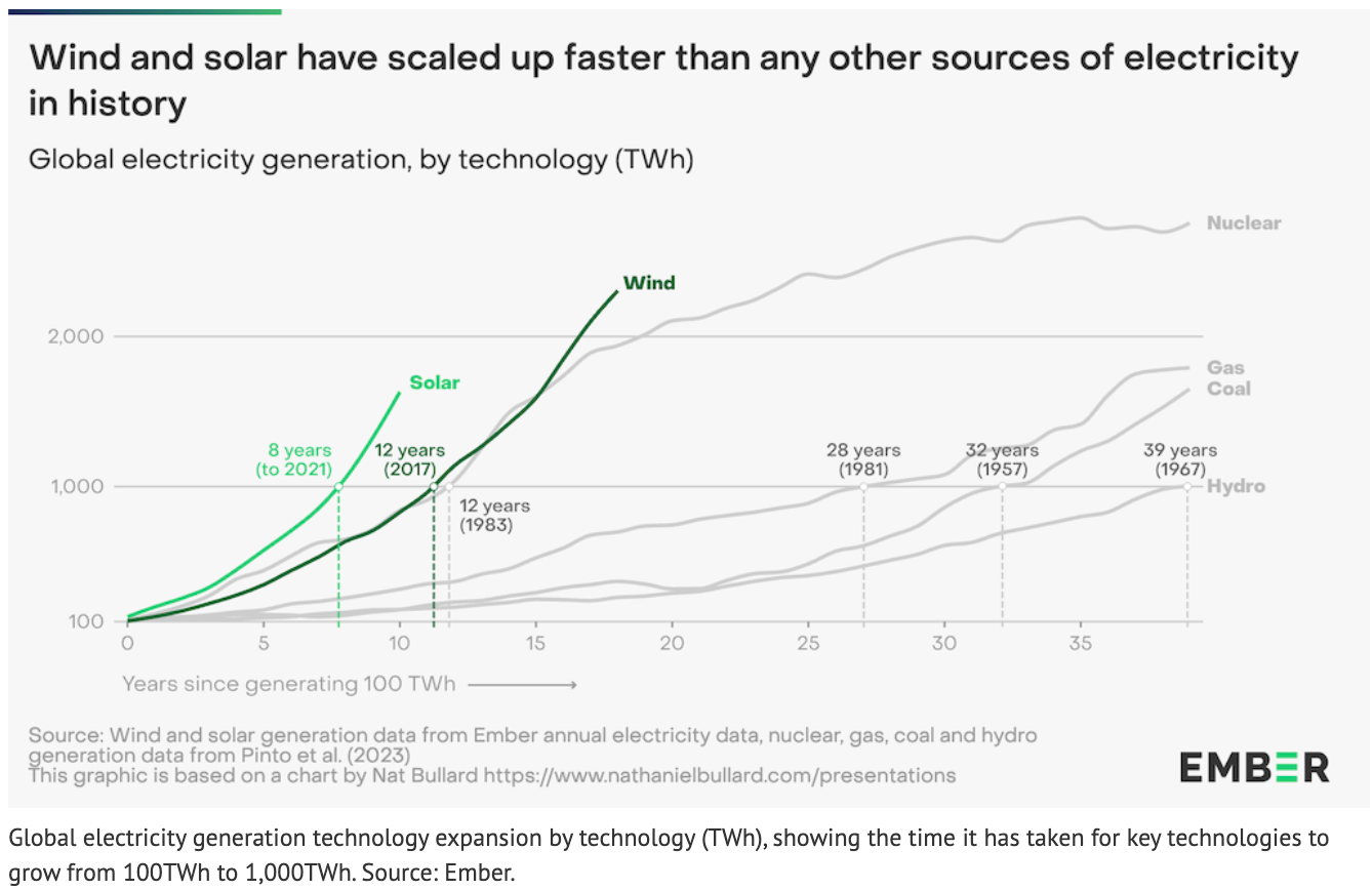 根據(jù)智庫(kù)Ember的最新報(bào)告分析,在全球范圍內(nèi)風(fēng)能和太陽(yáng)能的增長(zhǎng)速度比歷史上任何其他電力來(lái)源都快。太陽(yáng)能和風(fēng)能從每年100太瓦時(shí)增長(zhǎng)到1000太瓦時(shí),分別只花了8年和12年的時(shí)間。同樣是100太瓦時(shí)到1000太瓦時(shí),天然氣電廠花了28年、煤電化了32年、水電花了39年。
