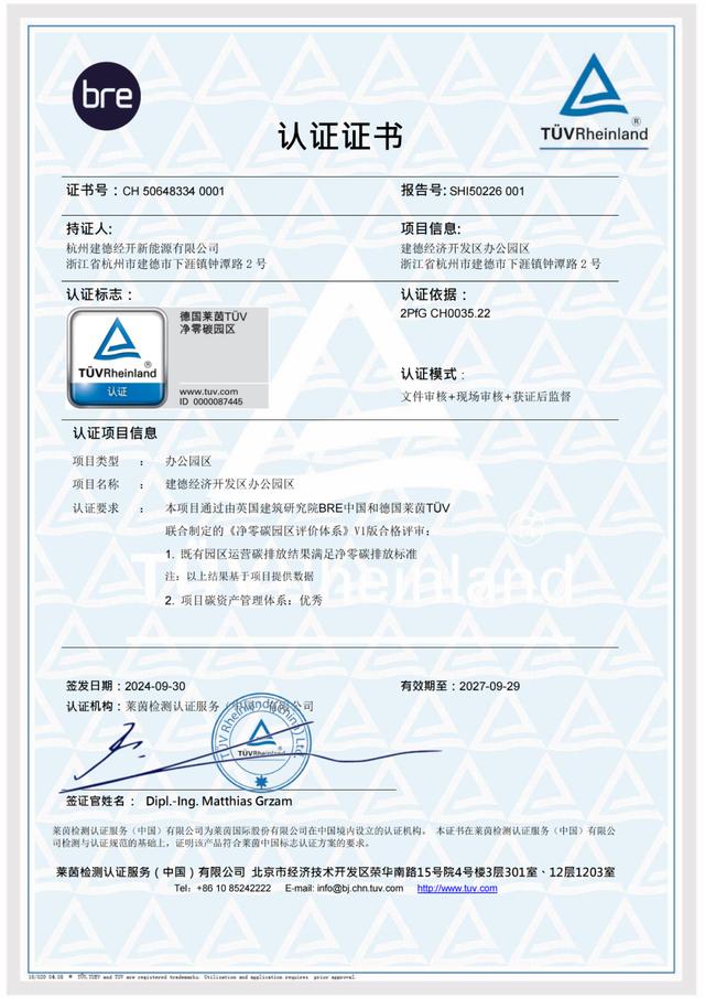 萬(wàn)幫數(shù)字能源協(xié)助建德經(jīng)濟(jì)開(kāi)發(fā)區(qū)辦公園區(qū)通過(guò)由英國(guó)建筑研究院BRE中國(guó)和德國(guó)萊茵TÜV 聯(lián)合制定的《凈零碳園區(qū)評(píng)價(jià)體系》V1版合格評(píng)審,并獲項(xiàng)目碳資產(chǎn)管理體系優(yōu)秀級(jí)評(píng)價(jià)。