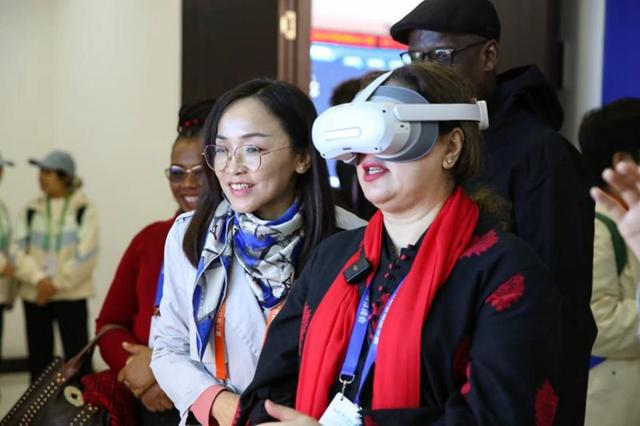 媒體代表使用VR設(shè)備感受光伏項(xiàng)目現(xiàn)場。