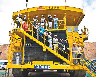 國際青年代表在國能準能集團綠色礦山登上無人駕駛卡車合影留念。 圖為本報記者吳勇攝