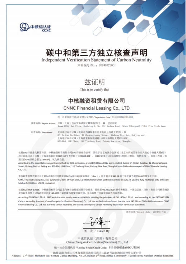 近日,中核融資租賃有限公司獲權(quán)威第三方機(jī)構(gòu)中誠信認(rèn)證頒發(fā)碳中和認(rèn)證,成為首家實(shí)現(xiàn)運(yùn)營碳中和的融資租賃公司。