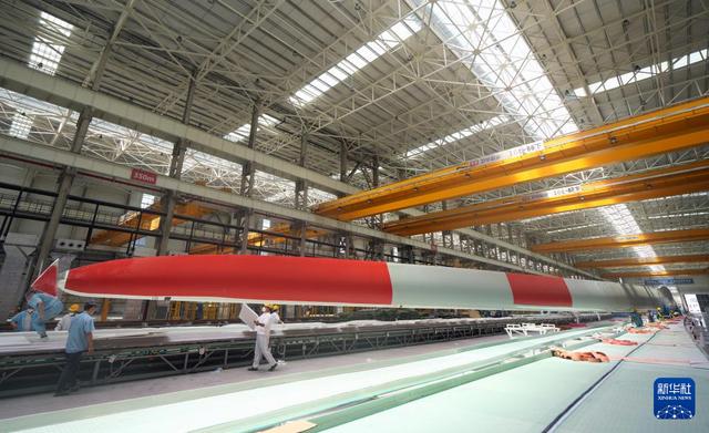 6月6日,在射陽(yáng)中車風(fēng)電葉片工程有限公司生產(chǎn)車間拍攝的大型風(fēng)機(jī)葉片。新華社記者 李尕 攝
