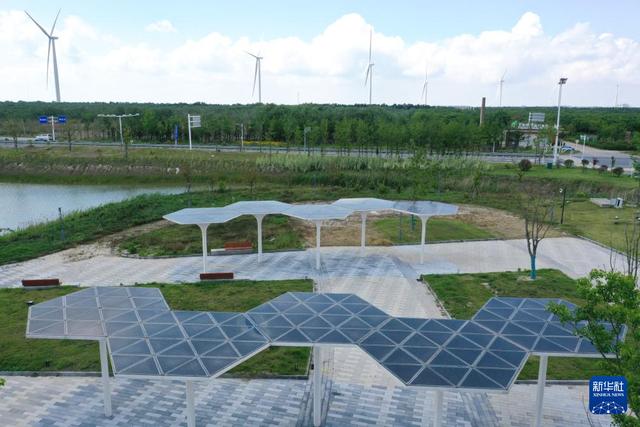 6月6日在射陽(yáng)港低(零)碳產(chǎn)業(yè)園拍攝的長(zhǎng)廊頂部太陽(yáng)能光伏系統(tǒng)(無(wú)人機(jī)照片)。新華社記者 楊磊 攝