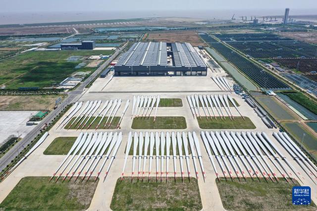 6月6日拍攝的位于射陽(yáng)港低(零)碳產(chǎn)業(yè)園的射陽(yáng)中車風(fēng)電葉片工程有限公司的外景照片(無(wú)人機(jī)照片)。新華社記者 楊磊 攝