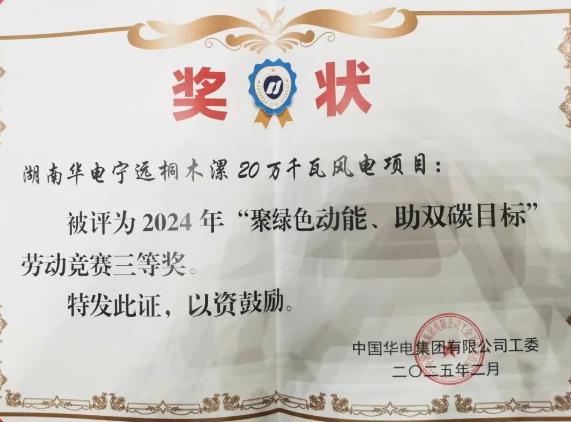 從《關(guān)于表彰2024年“聚綠色動能、助雙碳目標(biāo)”打通“堵點”專項勞動競賽先進集體和個人的決定》(中國華電工委〔2025〕37號)中獲悉,公司所屬桐木漯20萬千瓦風(fēng)電項目榮獲2024年集團公司“聚綠色動能、助雙碳目標(biāo)”勞動競賽三等獎。新能湖南分公司工程建設(shè)部(物資部)主任賀亮平榮獲2024年集團公司“聚綠色動能、助雙碳目標(biāo)”勞動競賽打通“堵點”能手榮譽稱號。