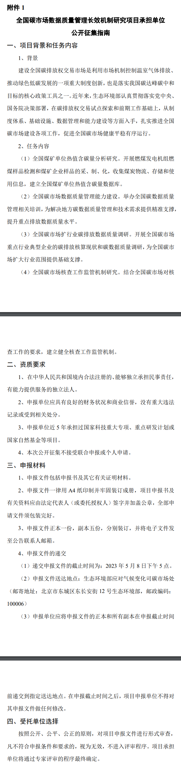 附 件:1.全國碳市場數(shù)據(jù)質(zhì)量管理長效機(jī)制研究項目承擔(dān)單位公開征集指南
