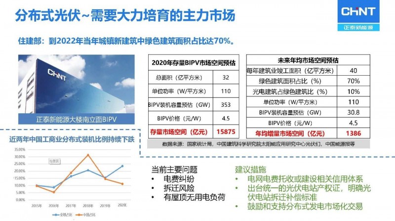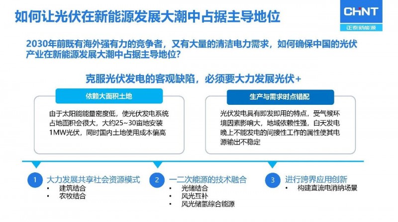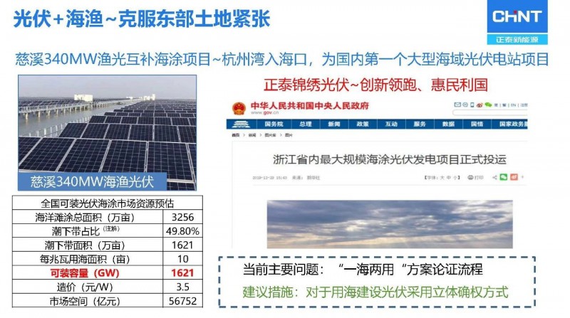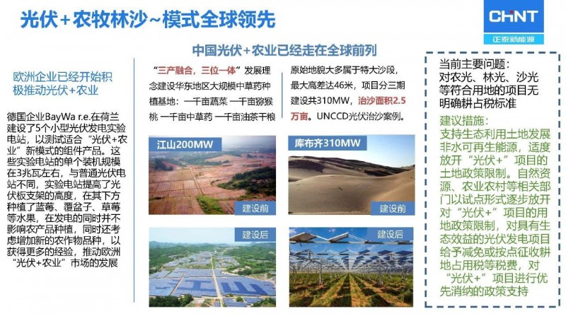 2021年2月3日,由中國光伏行業(yè)協(xié)會主辦的“光伏行業(yè)2020年發(fā)展回顧與2021年形勢展望網(wǎng)絡(luò)研討會”上,浙江正泰新能源開發(fā)有限公司總裁陸川針對我國目前光伏+融合發(fā)展模式趨勢進行了分析。我國已經(jīng)走在了全球光伏+農(nóng)業(yè)行業(yè)的前列,針對農(nóng)光互補電站,他希望能夠推動自上而下的關(guān)于農(nóng)光互補設(shè)施正常補償機制的兌現(xiàn)以促進行業(yè)更優(yōu)發(fā)展。光伏+海漁的合作方式適用于我國東南海岸,克服了東部土地緊張,不但能夠產(chǎn)生發(fā)電效益,同時還能產(chǎn)生漁業(yè)收益。光伏+儲能、光伏+風(fēng)電、光伏+制氫等均為我國光伏應(yīng)用新模式做出突出貢獻。戶用光伏的智能化應(yīng)用、光伏+信號基站的互補應(yīng)用、光伏+交通實現(xiàn)綠電出行等跨界創(chuàng)新的光伏應(yīng)用模式也將逐漸推廣,實現(xiàn)全社會層面的綠電應(yīng)用。