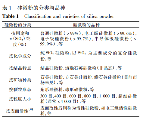 硅微粉:硅微粉產(chǎn)品系列比較復(fù)雜,應(yīng)用十分廣泛,除大型集成電路和芯片用硅微粉對(duì)SiO2純度有更高要求外,其它硅微粉通常要求w(SiO2)99%~99.9%,w(TFe)<100ppm。如表1所示,根據(jù)國家標(biāo)準(zhǔn)SJ/T10675—2002和筆者研究認(rèn)識(shí),硅微粉有多種分類和品種。