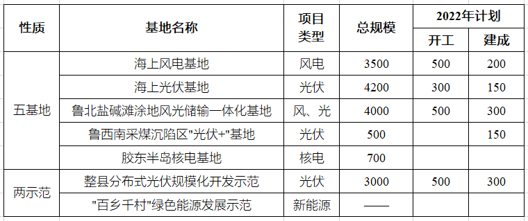 在此之前,3月3日,山東省能源局印發(fā)《2022年全省能源工作指導意見的通知》中,提出了“五基地二示范”工程,并規(guī)劃了35GW“海上風電基地”、42GW“海上光伏基地”。