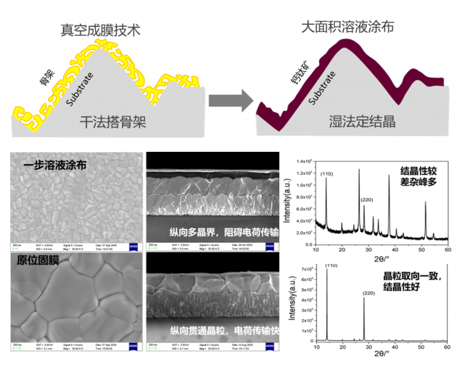 “極電光能在這方面有著自己獨(dú)創(chuàng)的‘氣相-液相’結(jié)合的兩步法鈣鈦礦制備技術(shù),我們稱之為‘原位固膜’法,可以有效地解決‘一步溶液涂布法’所遇到的上述問題?!庇诓┦拷榻B到,通過“干法搭骨架,濕法定結(jié)晶”的策略,可以把溶劑揮發(fā)與化學(xué)成鍵分開、形核與晶粒生長分離,而且“骨架層”充當(dāng)著結(jié)晶模板的作用,鈣鈦礦薄膜的結(jié)晶生長是在可控的條件下完成的,因此,受環(huán)境影響小,便于面積放大,工藝窗口寬,成品率高?!霸还棠ぁ惫に囍苽涞拟}鈦礦膜層質(zhì)量也顯著優(yōu)于“一步溶液涂布法”制備的鈣鈦礦材料,鈣鈦礦組件的效率更高。另外,它也可以在不平整的基底表面成膜,因此還可以很好的兼容與晶硅疊層電池的制備。
