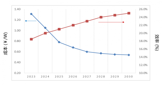 根據(jù)數(shù)據(jù)測算,到2023年平米級鈣鈦礦光伏產(chǎn)品將實(shí)現(xiàn)17-19%的效率,后續(xù)持續(xù)提升至25%。百兆瓦級產(chǎn)線階段成本也將控制在1.0-1.5¥/W之間;1GW級時能降到~0.8¥/W;10GW級降到~0.6¥/W??紤]到鈣鈦礦組件成本較低,如果其效率達(dá)到17%,價格達(dá)到1.3¥/W,壽命25年時,就擁有市場競爭力。