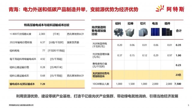 以前,在建設(shè)燃煤電站時,要做的經(jīng)濟分析是對比運煤和輸電成本。而我們今天在青海要做的是輸電和把電力就地轉(zhuǎn)化成產(chǎn)品的成本對比分析。在青海建設(shè)附加值高、技術(shù)和用能密集的多晶硅料,然后把部分多晶硅料就地加工成碳足跡低的綠色光伏組件產(chǎn)品,另一部分硅料運輸?shù)侥茉炊倘笔》菔褂?。?jù)國家發(fā)改委新近發(fā)布的三條特高壓線路的輸電價格,我們測算硅料運輸?shù)某杀静患拜旊姵杀镜?/7。
