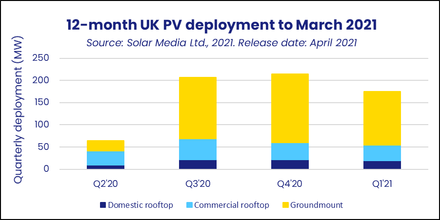截止到3月底的12個月中,英國新增并網(wǎng)太陽能發(fā)電容量660兆瓦。根據(jù)英國太陽能協(xié)會數(shù)據(jù),預(yù)計(jì)2021年,全國新增安裝量可能達(dá)到1,000兆瓦,因?yàn)樵谌齻€主要市場,即住宅,商業(yè)屋頂和地面安裝市場均實(shí)現(xiàn)增長。