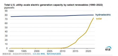 投資稅收抵免等激勵措施鼓勵了可再生能源發(fā)電能力的增長。截至2023年8月,美國太陽能裝機(jī)容量總計超過125吉瓦(GW),其中包括80吉瓦的公用事業(yè)規(guī)模太陽能容量和估計45吉瓦的小型太陽能容量。過去幾十年來,美國的水力發(fā)電容量相對穩(wěn)定地保持在80吉瓦左右。