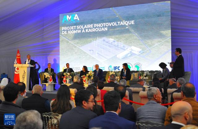 這是5月8日在突尼斯凱魯萬省拍攝的光伏電站項(xiàng)目開工儀式現(xiàn)場(chǎng)。新華社發(fā)(阿代爾攝)