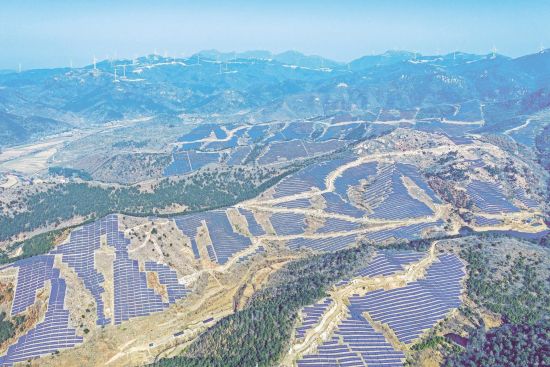 發(fā)電站背后十幾個山頭的向陽坡上,分散著占地700多畝的太陽能光伏發(fā)電場,在陽光下熠熠生輝。光伏板每塊約0.75平方米,總計有160萬塊,總裝機容量50兆瓦。在光照條件好的情況下,光伏板每天可發(fā)電近20萬千瓦時。