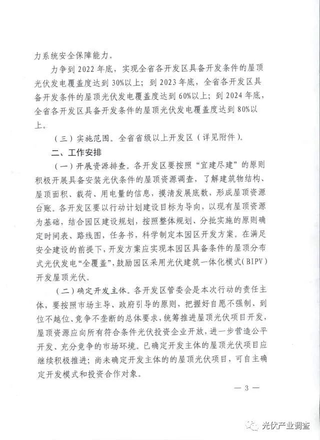 力爭到2022年底,實(shí)現(xiàn)全省各開發(fā)區(qū)具備開發(fā)條件的屋頂光伏發(fā)電覆蓋度達(dá)到30%以上;到2023年底,全省各開發(fā)區(qū)具備開發(fā)條件的屋頂光伏發(fā)電覆蓋度達(dá)到60%以上;到2024年底,全省各開發(fā)區(qū)具備開發(fā)條件的屋頂光伏發(fā)電覆蓋度達(dá)到80%以上。
