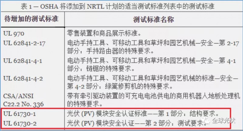 OSHA 于 2021 年 8 月 16 日發(fā)布通知,宣布修改 NRTL 計(jì)劃的適當(dāng)測(cè)試標(biāo)準(zhǔn)清單和認(rèn)可范圍的提案 ( 86 FR 45755 )。其中和光伏產(chǎn)品相關(guān)的是光伏組件的安全認(rèn)證標(biāo)準(zhǔn)。