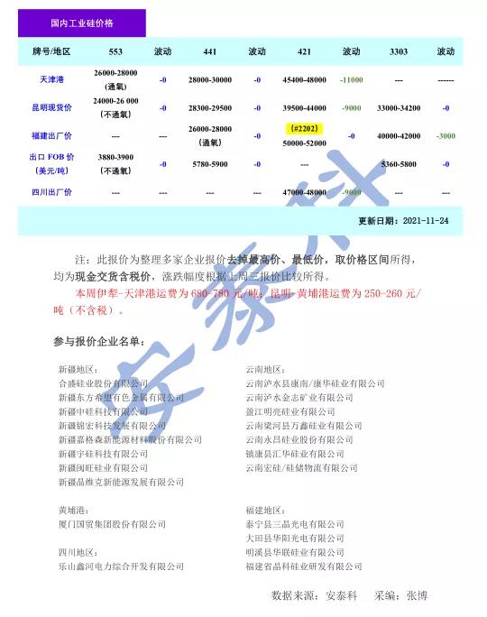 本周國內冶金級價格相對持穩(wěn),化學級價格持續(xù)下跌。目前市場553#、441#價格與上周持平,421#價格下跌區(qū)間9000-11000元/噸,3303#價格下跌3000元/噸,各牌號FOB出口價持穩(wěn)運行。