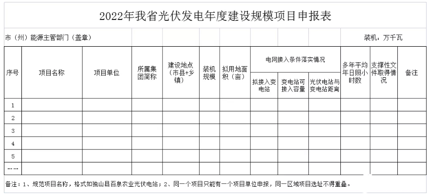 為積極貫徹落實(shí)國家“碳達(dá)峰、碳中和”工作目標(biāo),實(shí)現(xiàn)我省能源產(chǎn)業(yè)轉(zhuǎn)型、高質(zhì)量發(fā)展,有序推進(jìn)新能源項(xiàng)目建設(shè),根據(jù)《貴州省風(fēng)電光伏發(fā)電項(xiàng)目管理暫行辦法》,現(xiàn)開展我省2022年風(fēng)電光伏發(fā)電年度建設(shè)規(guī)模項(xiàng)目申報工作,有關(guān)事項(xiàng)通知如下: