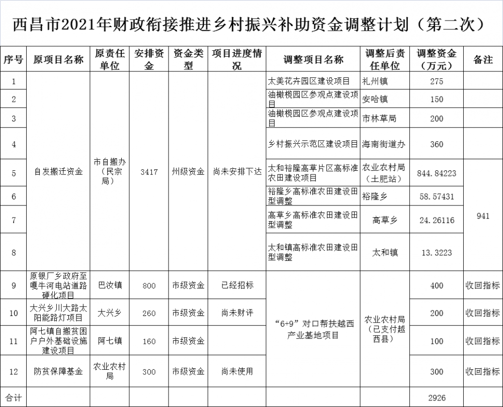 根據(jù)西昌市鄉(xiāng)村振興局《關(guān)于再次調(diào)整使用2021年銜接推進(jìn)鄉(xiāng)村振興補(bǔ)助資金的請示》(西鄉(xiāng)振發(fā)(2021)18號)文件及領(lǐng)導(dǎo)批示,現(xiàn)將2021年下達(dá)市委統(tǒng)戰(zhàn)部(自搬辦):1、自發(fā)搬遷資金1926萬元調(diào)整到禮州鎮(zhèn)太美花卉園區(qū)建設(shè)項目275萬元、 安哈鎮(zhèn)油橄欖園區(qū)參觀點建設(shè)項目150萬元、市林草局油橄欖園區(qū)參觀點建設(shè)項目200萬元、海南街道辦事處鄉(xiāng)村振興示范區(qū)建設(shè)項目360萬元、太和裕隆高草片區(qū)高標(biāo)準(zhǔn)農(nóng)田建設(shè)項目941萬元;2、收回以下單位指標(biāo):⑴、巴汝鎮(zhèn)原銀廠鄉(xiāng)政府至嘎牛河電站道路硬化項目資金400萬元;⑵、大興鄉(xiāng)川大路太陽能路燈項目資金200萬元;⑶、阿七鎮(zhèn)自搬貧困戶戶外基礎(chǔ)設(shè)施建設(shè)項目資金100萬元;⑷、農(nóng)業(yè)農(nóng)村局防貧保障基金300萬元;3、將西昌市援建越西縣 “6+9”對口幫扶越西產(chǎn)業(yè)基地項目1000萬元調(diào)入鄉(xiāng)村振興項目,給予在網(wǎng)上公示。