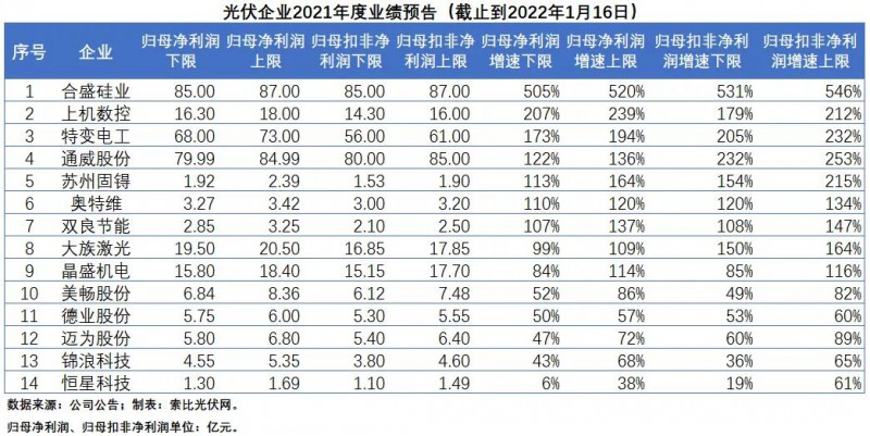 根據(jù)上交所和深交所的規(guī)定,上市企業(yè)上一年的年度經(jīng)營業(yè)績同比增長或下降超過50%,需要在當(dāng)年的1月31日前發(fā)布業(yè)績預(yù)告。在光伏企業(yè)2021年前三季度經(jīng)營業(yè)績集體大漲的背景下,相信在接下來不到半個月的時間里,還會有更多的光伏企業(yè)披露業(yè)績預(yù)告。
