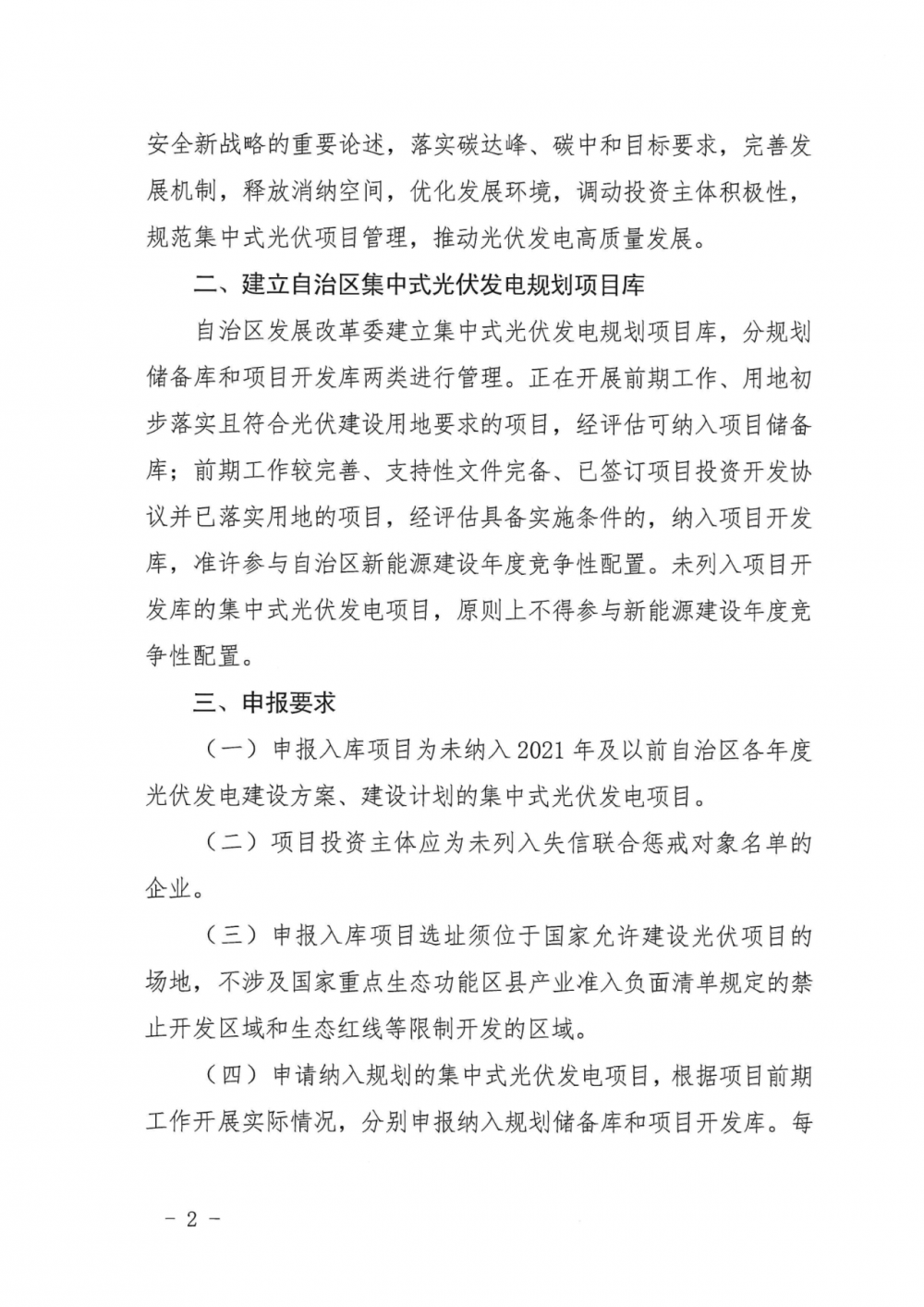 在具體申報(bào)要求方面,主要為未納入2021年及以前自治區(qū)各年度光伏發(fā)電建設(shè)方案、建設(shè)計(jì)劃的集中式光伏發(fā)電項(xiàng)目。項(xiàng)目建設(shè)地不涉及禁止開(kāi)發(fā)區(qū)域和生態(tài)紅線等限制開(kāi)發(fā)的區(qū)域。
