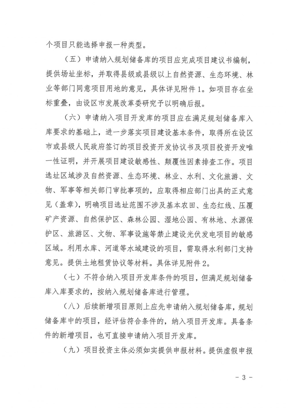 根據(jù)文件要求,集中式光伏發(fā)電規(guī)劃項(xiàng)目庫(kù)分為開(kāi)發(fā)庫(kù)和儲(chǔ)備庫(kù)兩類。正在開(kāi)展前期工作,初步落實(shí)土地條件的項(xiàng)目可納入儲(chǔ)備庫(kù);前期工作比較完善,支持文件完備,且簽訂項(xiàng)目投資開(kāi)發(fā)協(xié)議并已落實(shí)用地的項(xiàng)目可納入開(kāi)發(fā)庫(kù)。未列入項(xiàng)目開(kāi)發(fā)庫(kù)的集中式光伏發(fā)電項(xiàng)目,原則上不得參與新能源建設(shè)年度競(jìng)爭(zhēng)性配置。