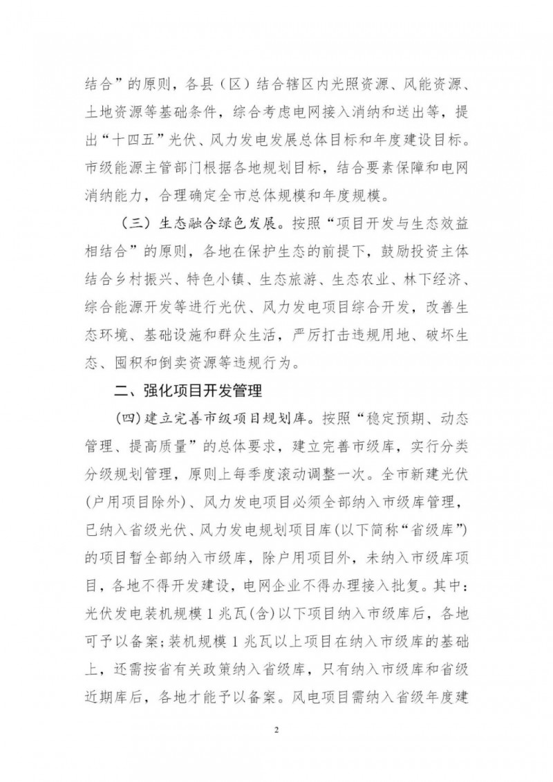文件指出,建立完善市級(jí)項(xiàng)目規(guī)劃庫。按照“穩(wěn)定預(yù)期、動(dòng)態(tài)管理、提高質(zhì)量”的總體要求,建立完善市級(jí)庫,實(shí)行分類分級(jí)規(guī)劃管理,原則上每季度滾動(dòng)調(diào)整一次。全市新建光伏(戶用項(xiàng)目除外)、風(fēng)力發(fā)電項(xiàng)目必須全部納入市級(jí)庫管理,已納入省級(jí)光伏、風(fēng)力發(fā)電規(guī)劃項(xiàng)目庫(以下簡(jiǎn)稱“省級(jí)庫”)的項(xiàng)目暫全部納入市級(jí)庫,除戶用項(xiàng)目外,未納入市級(jí)庫項(xiàng)目,各地不得開發(fā)建設(shè),電網(wǎng)企業(yè)不得辦理接入批復(fù)。其中:光伏發(fā)電裝機(jī)規(guī)模1兆瓦(含)以下項(xiàng)目納入市級(jí)庫后,各地可予以備案;裝機(jī)規(guī)模1兆瓦以上項(xiàng)目在納入市級(jí)庫的基礎(chǔ)上,還需按省有關(guān)政策納入省級(jí)庫,只有納入市級(jí)庫和省級(jí)近期庫后,各地才能予以備案。風(fēng)電項(xiàng)目需納入省級(jí)年度建設(shè)方案后方可核準(zhǔn)實(shí)施。